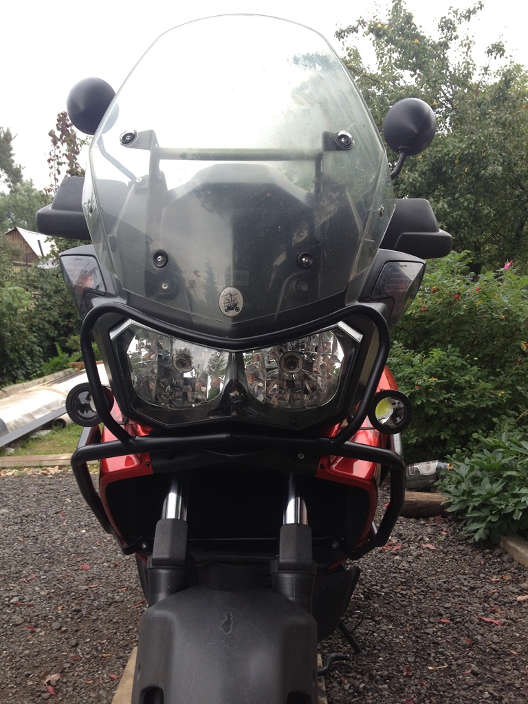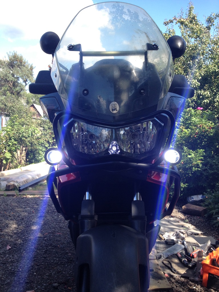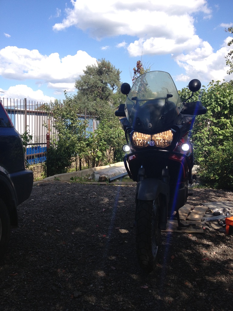 1-е! Долгожданные противотуманки. Если честно, заеб..устал их ставить. Передумал кучу мест по установки и решил сюда т.к. не повреждаются при завале мота и можно регулировать. Подключал через реле. Кнопку нормальную не дождался поставил какая была, жалко без подсветки но ниче, пойдет. Крепил к пластику через двухсторонний скотч, а внутри не малая алюминиевая пластина для жесткости. Держится каменно и смотрится супер! а свет....это надо видеть в реале. Не передать)