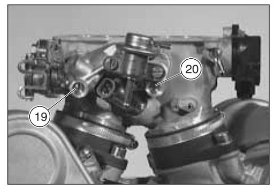 Итак... На инжекторе есть два регулировочных болта, которые, как я понял, отвечают за количество подаваемого топлива в форсунки. Для настройки нужны специальные приборы, которых у меня нет. Кто может на своем RSV аккуратно пометить, в каком положении были это болты, и закрутить до упора, при этом считая количество оборотов (мне очень надо знать это), затем выкрутить в первоначальное положение? Кому не сложно и не страшно - посчитайте, пожалуйста, и отпишитесь по пунктам: 1. Количество этих оборотов на болтах, что на картинке под номером 19 и 20: