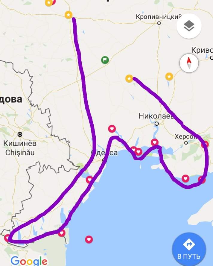 Начало октября.из Киева В Киев .Южное побережье материка от Молдавии до Скадовска —вдоль моря ,озёр и рек . Покорены и изучены 2500 км . дождь, ветер, солнце ,туман, песчаные дюны, море,чайки,лебеди улетающие на юга ,рыбалка, змеи, лодки ! У нас было все с изобилием
