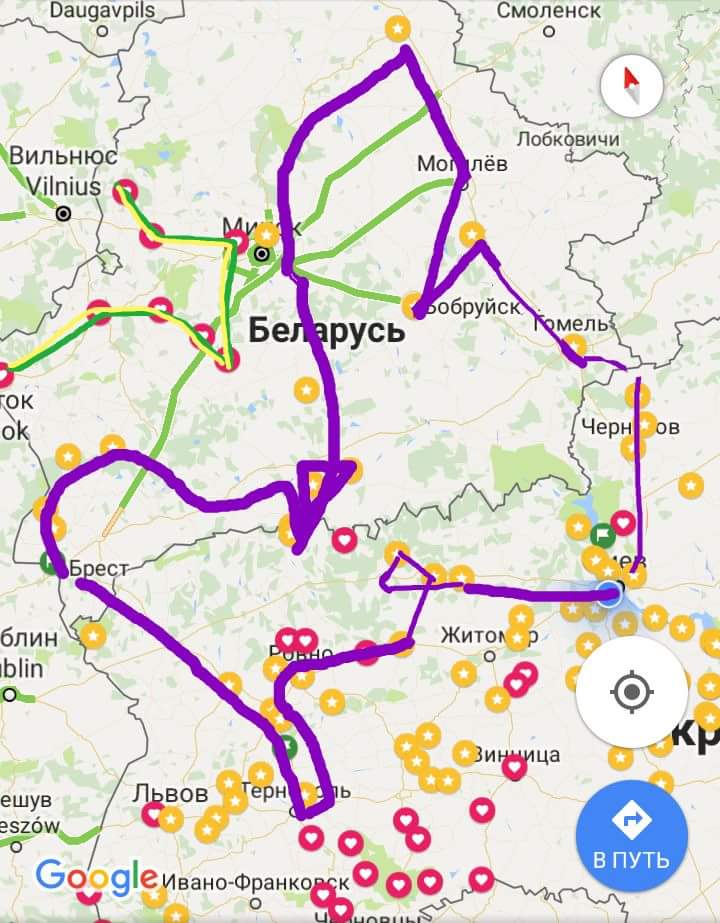 Начало сентября .Киев—Гомель—Витебск—Минск—Могилев—Брест и многое попутно на Киев. Привет ребятухи ! Не прошло много времени и решил накрапать очерк об одиноком путешествующем Пегасе 650. Планировал два маршрута ,выпал жребий на этот. Дорога 3500 км и 10 дней . Многие скажут медленно , ответ , зато много видел и насладился красотой природы и замками . Граница без особых проблем, 40 минут. Много бюрократии В бумажном эквиваленте. Ехать нужно только с валютой ,проблем с ее обменом нет и курс хороший и одинаковый на всей территории Белоруссии. Бензин хороший, тоже цена везде одинаковая. А вот количество азс реденько, советую и сам так поступил , возил 10 л резервного бензина. Не пригодились но были моменты —почти ! дороги отличные, люди хорошие,водители автомобилей в 90 % уважают мотоциклистов. Фиолетовым пройденный маршрут , а желто—зелёный на следующий раз пришлось оставить из-за непогоды.попал в шторм на 5 дней.