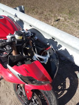 Полностью оторвана морда, разорван на части алюминиевый паук-воздухозаборник. Пластик разбит, бак помят. Зато все основные узлы и агрегаты даже не пострадали. У меня болит башка, полностью отбита левая часть тела - я даже руку поднять не могу, большая шишка на левой ступне. Вроде переломов нет... если завтра будет хуже - пойду на рентген. Из позитивного: 1. Я жив, и вроде даже здоров. 2. Мотик чинибелен, но долго (с учетом нынешней ситуации в стране и мире) 3. Подвеску мне настроили очень хорошо. 4. Сзади при свешиваниях я выгляжу почти как гонщик мотоГП Еще немного - и буду чертить локтями. А коленом я не чиркаю потому, что машинально его поджимаю.