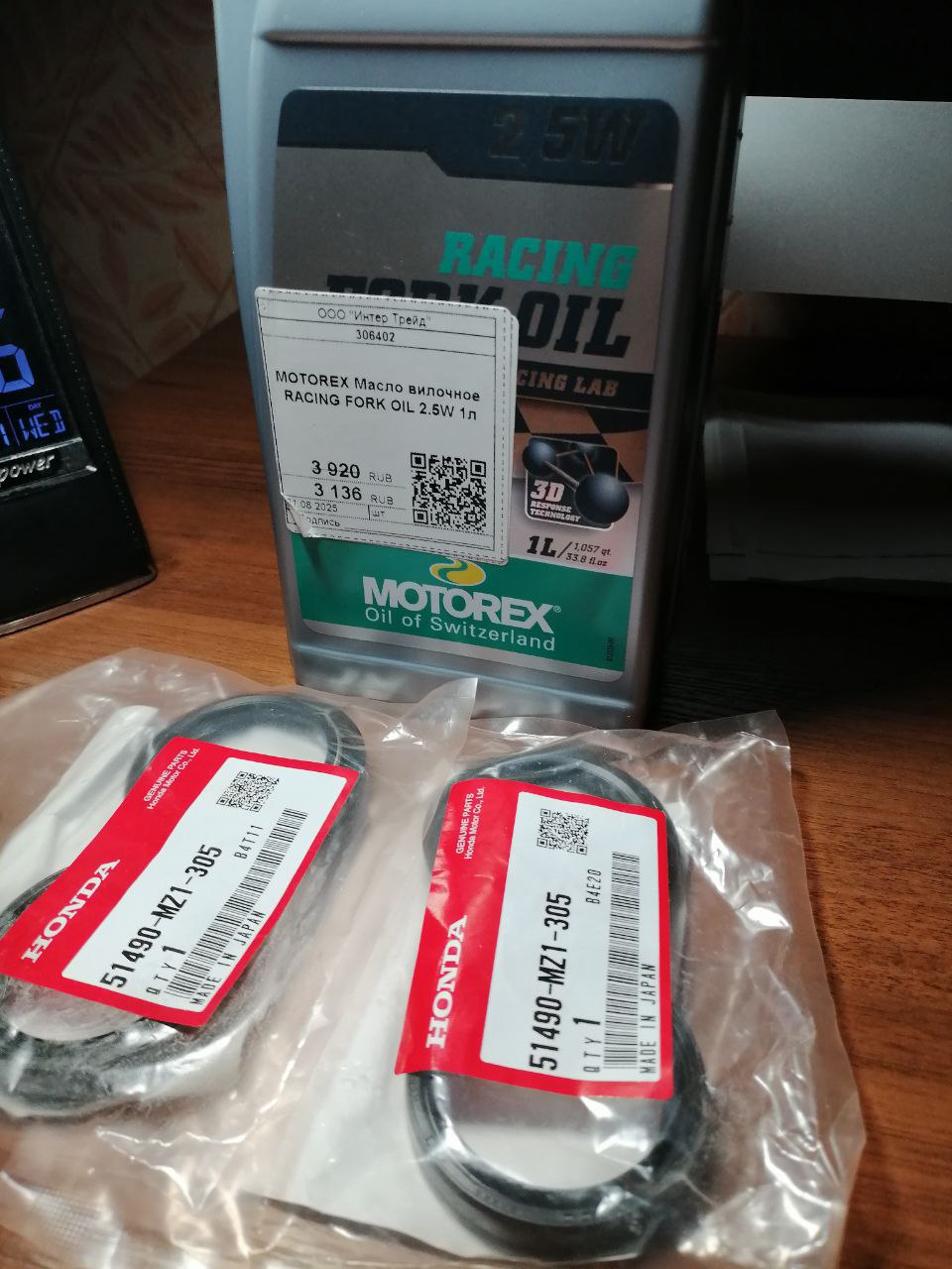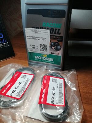 Купил сегодня масло в вилку Motorex Racing Fork Oil 2,5W за 3136 рэ и фирменный хондовский набор сальников и пыльников в вилку за 4500 рэ: