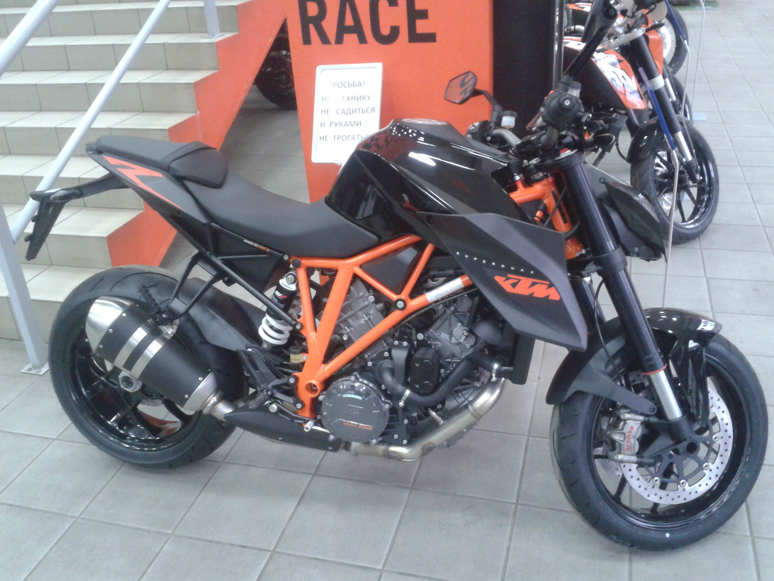 4. Будет ли продаваться выхлопная система Akrapovič, которая была прототипе, представленном на EICMA 2012? Выхлопная система прототипа — специальный компонент, разработанный специально для шоу. Данная система производит слишком много шума и выхлопных газов, поэтому её нельзя применять на производственной модели. Пару слов, чтобы внести ясность, насколько громкий тот выхлоп. Изначально мы (KTM) планировали снимать первое видео прототипа на треке, но нам не позволили, потому что громкость мотоцикла сравнима со стартом реактивного самолета. Таким образом, мы попытали счастья в месте, где обычно обитают истребители. К счастью, нам разрешили снимать в аэропорту.