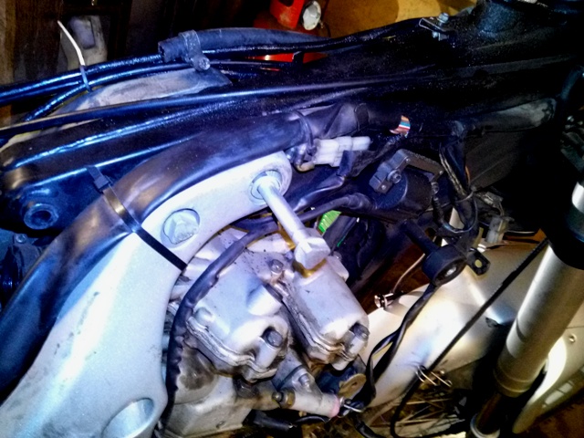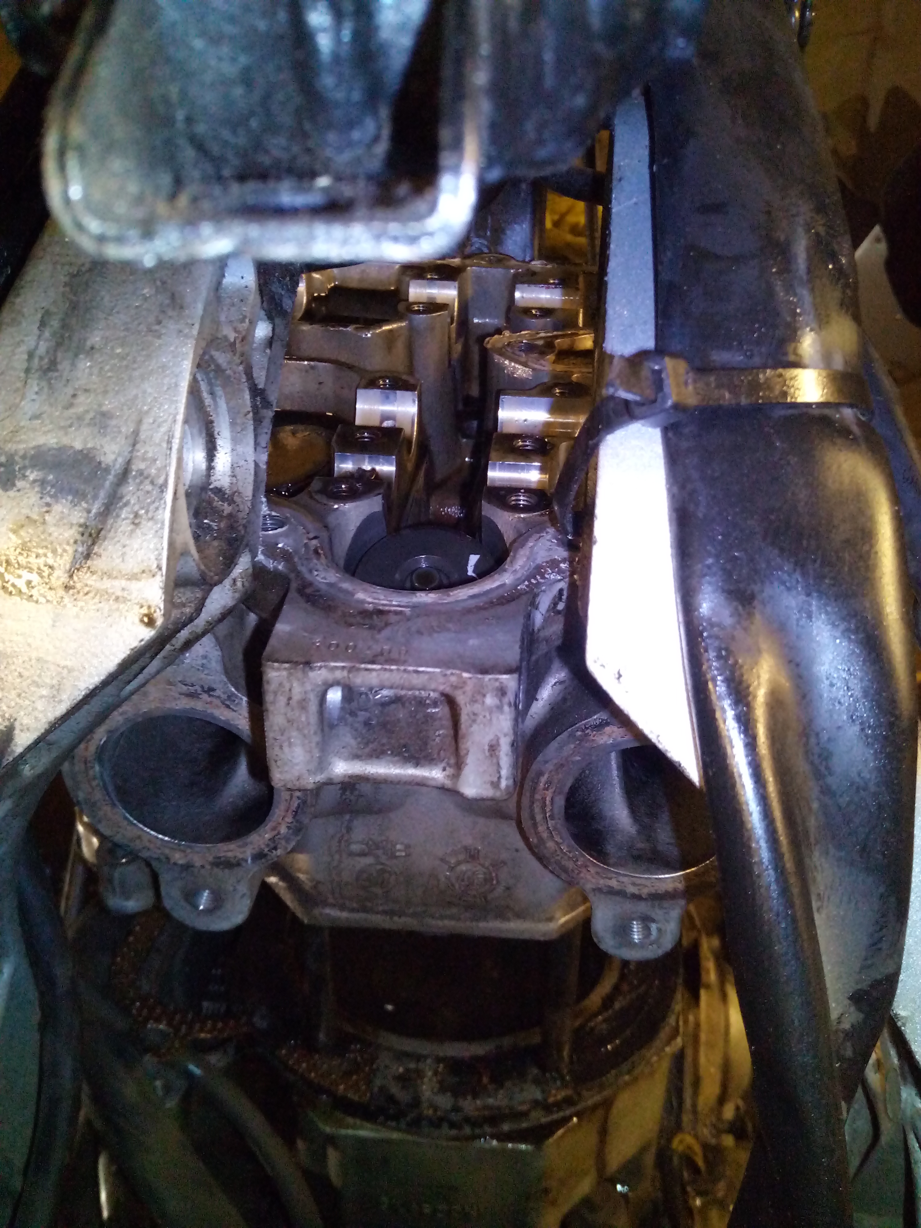Снимаешь бак, передний пластик для удобства. Скидываешь радиатор, убираешь всю мелочевку, проводку чтобы не мешалась. Снимаешь карбы. Потом откручиваешь крепления маслобака, 2 винта с треугольными головками над карбами и 2 болта за радиатором, где рама соединятся, ломиком поддеваешь и тащишь это вверх максимально, только аккуратно, а то я когда тащил, у меня вся конструкция с вилкой и передним колесом чуть не вывалилась из пазов, и я бы заколебался один ее ставить назад. Не повторяйте моих ошибок) Ставишь распорку какую-нибудь, чтоб это обратно все не рухнуло. Ну и дальше по классике, крышку ГБЦ без проблем откручиваем, выставляем метки в одной плоскости, желательно все с разных сторон сфотографировать чтобы на всякий пожарный были фотографии ДО. С правой стороны двигателя внизу выкручиваем заглушку пластиковую отверткой, ставим шестигранник на 6 и крутим двигатель пока поршень не будет в ВМТ. Для этого выкручиваем болт-заглушку с левой стороны под крышкой корзины сцепления(в этом обсуждении есть фото) и крутим двигатель, когда в отверстии появляется канавка вкручиваем длинный болт закругленный на конце 6*50 вроде, чтобы зафиксировать это все добро. Как только оно зафиксировано снимаем натяжитель ГРМ, распредвалы и не путаем болты и скобы под них, так же потом и ставим. Правый натяжитель цепи ГРМ просто тащим вверх, он ничем по сути не держится, сильнее дернул и вытащил... 5 болтов на 15 и голова скинута. Убираешь остатки старой прокладки, я пол дня сидел чистил зубной щеткой и очистителем карбюратора. Заодно можешь проверить зазоры клапанов, т.к. голову один хрен скидываешь) Ставишь прокладку обратно, в мануале указано по разному тянуть голову, я протягивал около 60 Нм, вроде все норм, по ощущениям даже еще тянулась, но сильно не стал тянуть, т.к. можно сорвать шпильки нахрен. Потом собираешь все обратно, ставишь натяжитель и выставляешь метки. Перед тем как ставить крышку крутани двигатель вручную чтобы он сделал 2 полных хода, чтобы цепь ГРМ села нормально, проверь снова метки и можешь закрывать и собирать все. Если есть возможность при установке маслобака в пазы обратно, лучше позвать еще кого-то, чтобы помогали ставить. В одно лицо я задолбался это делать(хотя может просто не стоило так сильно выносить вверх ее?) И все, собираешь, запускаешь двиг и смотришь на работу, если все гуд. Забываешь до весны, катаешься. Проезжаешь 1000 км и потом снова, нужно скидывать распредвалы чтобы протянуть голову, это самая важная протяжка в жизни прокладки, потом раз в 12 тыс. км. Вроде все описал как делал. Но в этой теме уже все описано, мне когда предстояла замена, я ее ни один раз перечитывал)