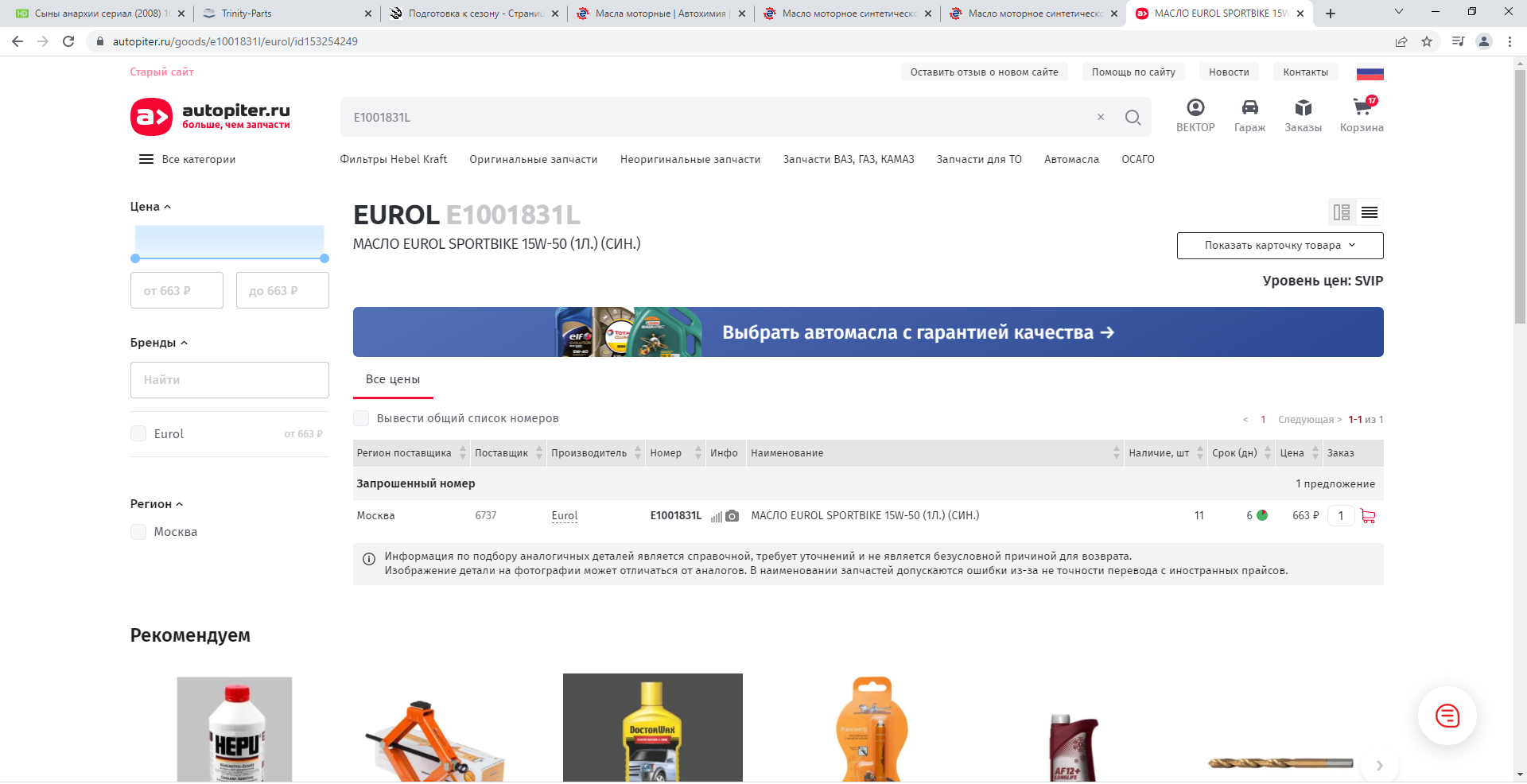 В прошлом сезоне чуть хер не отвис от ценника на Pakelo, залил Liqui Moly Motorbike 4T Street 15W-50, сейчас чисто ради спортивного интереса полез поискать и О ЧУДО ! есть в доступе Eurol Sportbike 15W-50 (номер для заказа E100183 - 1L ), я его юзал не на одном мотоцикле, очень доволен остался. В прошлом сезоне его было не достать вообще, даже с европы знакомые дальнобои мне его не привезли. Сейчас в доступе было 11 штук, 4 я забрал, кому интересно - поторопитесь!